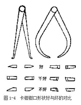 首先檢查鉗口的形狀,鉗口形狀對測量精確性影響很大,應注意經常修整鉗口的形狀,圖1-4所示為卡鉗鉗口形狀好與壞的對比。